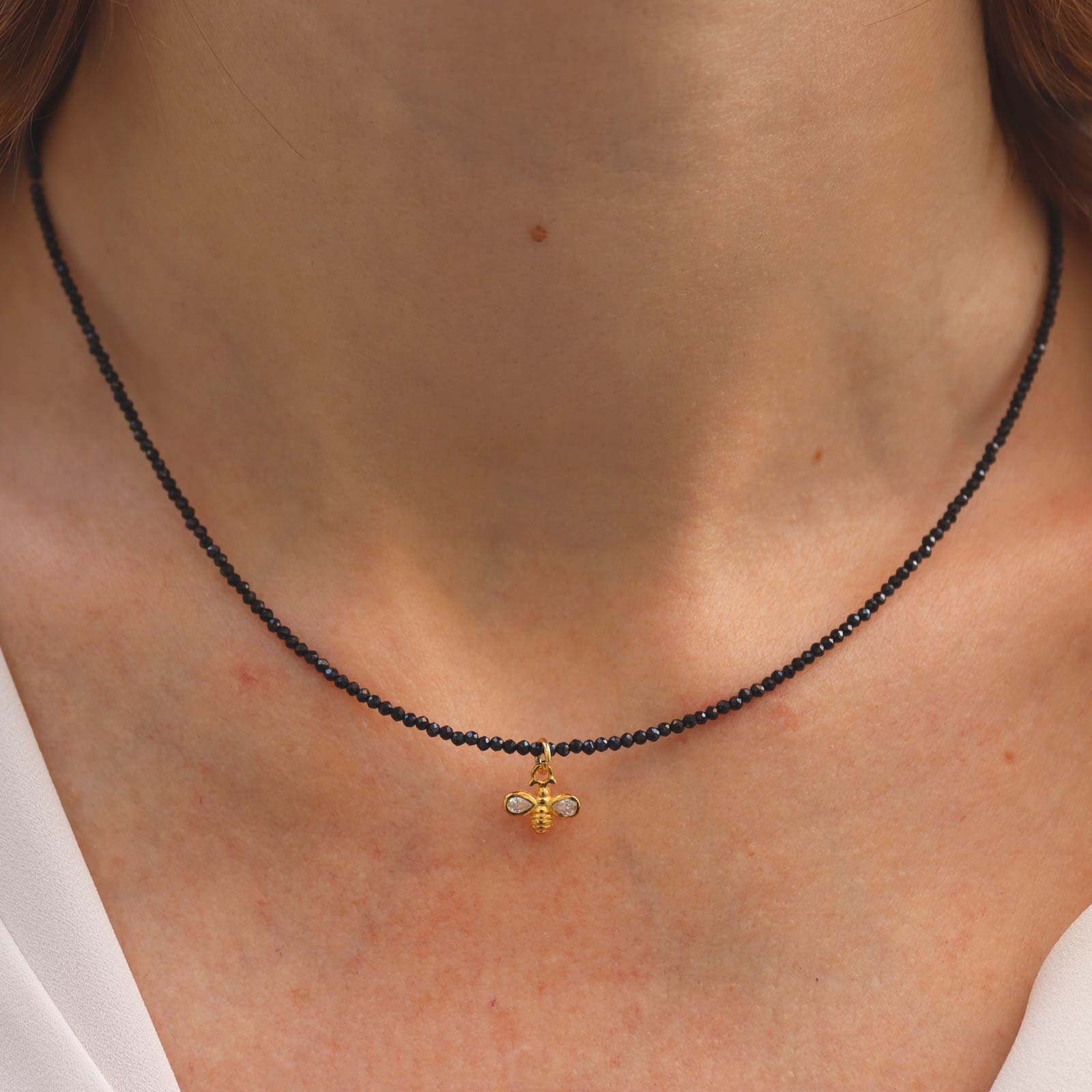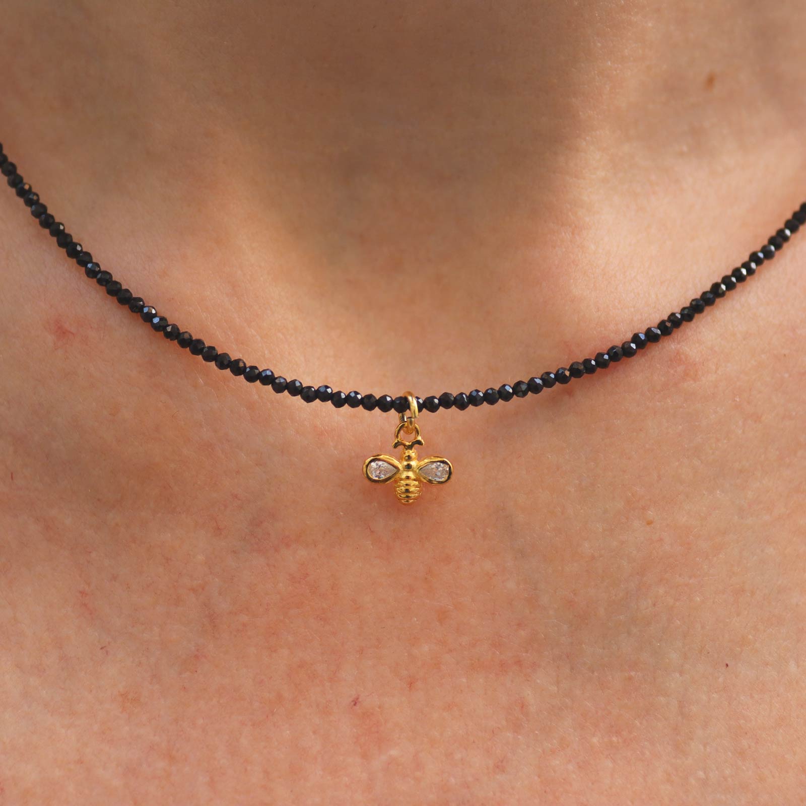 Collar de espinela con charm de abeja con zirconita, elaborado en Plata de Ley 925 con baño de Oro. Las abejas son animales muy trabajadores que se han relacionado con el trabajo constante desde la Antigüedad.
