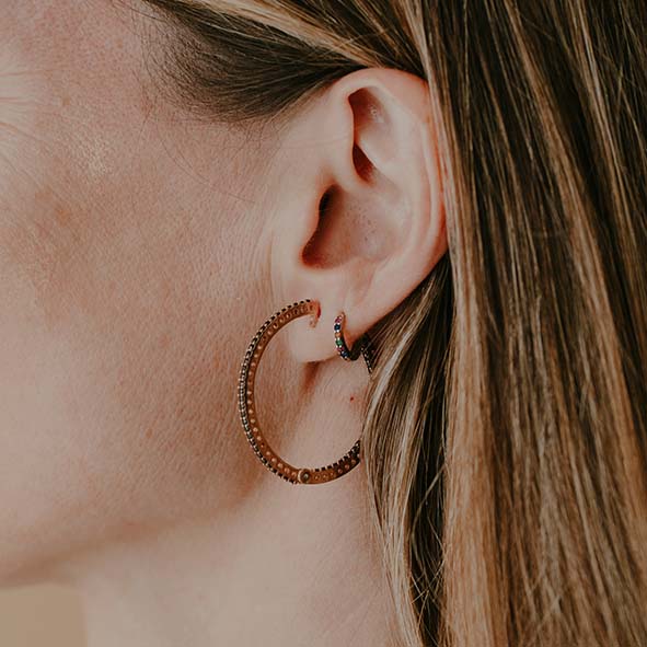 Pendientes de aros con zirconitas negras, elaborados en Plata de Ley 925 en Plata con baño de oro rosa.